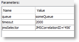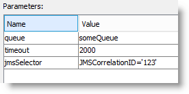 The "receive" requires the name of the queue, a timeout on how long to wait and the criteria to decide which item to receive from the queue (the jmsSelector). One important thing to note is that the correlation value should be in single quotes, this is unlike the send properties where the quotes are not required.