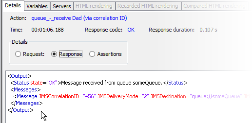 Looking at the receives shows us that the messages have been received from the queue correctly and that the "jmsSelector" parameter has allowed us to take the correct items from the queue using the "JMSCorrelationID" value identifier.