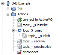 We connect, subscribe and loop around publishing messages to a particular topic. We can then receive all 5 messages, unsubscribe and disconnect. Like the "connect" above, the JMS settings for the "connect" Action are the same except that we are now connecting to a topic rather than a queue.