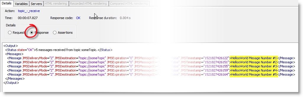 Finally, the "receive" Action will download all 5 messages, we unsubscribe and we disconnect using the "disconnect" Action.