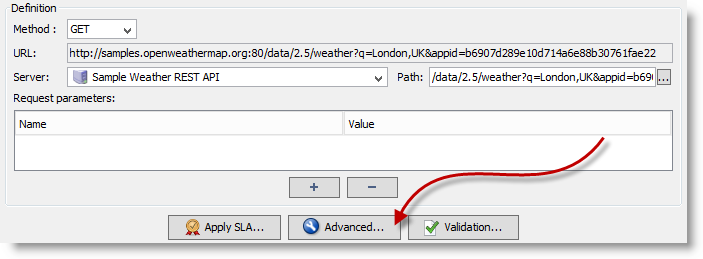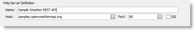 The API used in this example is a sample provided by "samples.openweathermap.org". Weather related information is returned based on the location we provide. We name the server entry and enter the host details.
