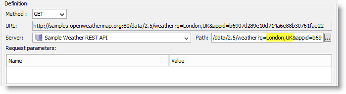 In the HTTP request, select the server entry created above and enter details of the URL path where the REST API can be found. In this example we will be using an HTTP GET method and supplying the location.