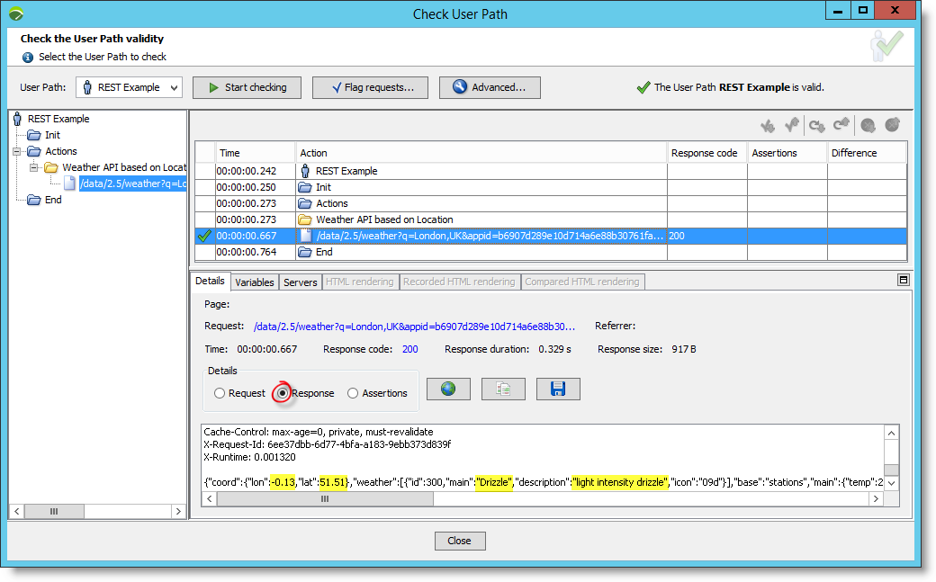 The next step is to execute the request and view the result by running the Check User Path.