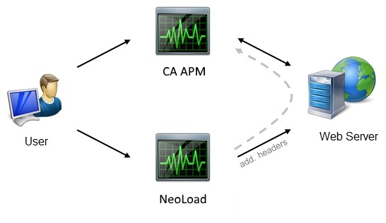 When the function is enabled, the NeoLoad module for CA APM sends HTTP headers with information about Virtual Users and transactions to CA APM. This makes it easier to analyze the root causes of slow or failed transactions which occur during load tests with CA APM which segregates web page response times and other performance metrics using the information provided by NeoLoad.