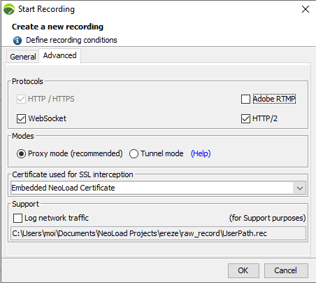 In the Design section of NeoLoad, click Start Recording. In the Start Recording dialog box, specify a new Virtual User.