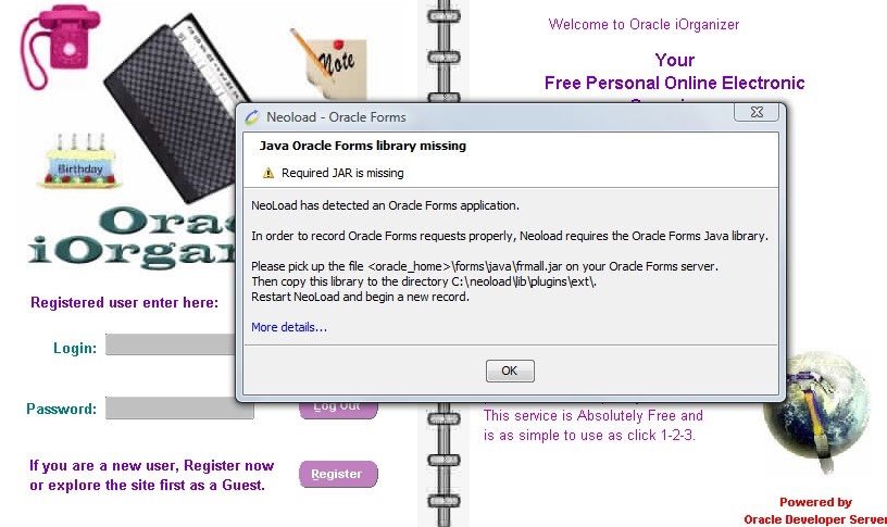 For NeoLoad to function properly, a Java library from the Oracle Forms application server must be copied in NeoLoad. The library must be placed in the folder specified in the message. For more information, see Configure NeoLoad.