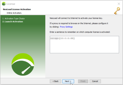 To install a license key that requires activating, the NeoLoad License Activation wizard is displayed. The wizard is also accessible at any time with Help > License management > License section > Activate license button.