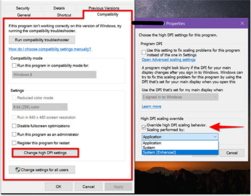 A second pop-up window appears on the screen. Check the box next to Override high DPI scaling behavior.
