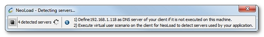 The Detecting servers bar shows the IP address of NeoLoad. When NeoLoad and the application sit on two different machines, it is necessary to change the IP address of the DNS server of the machine using the application to reroute transactions towards NeoLoad.