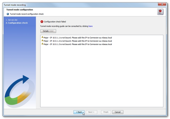 Once IPs and ports are ready, clicking Back in the Tunnel mode recording wizard makes it possible to restart the Configuration check step. When the configuration is ready, a click on Finish closes the wizard.