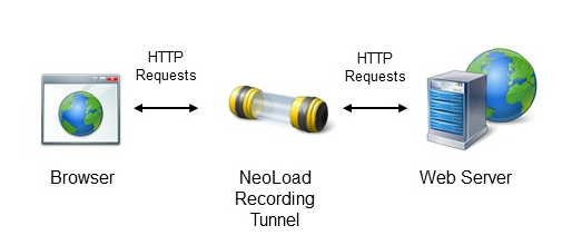 On one side, the tunnel simulates the web server for the browser, and on the other side, it processes the requests and responses with the web server. The recorder catches the transactions to build the scenario. NeoLoad allows filtering the recording and skipping or including some requests to get an accurate scenario.