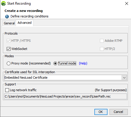 WebSocket: This option makes it possible to record a WebSocket application. For more information, see WebSocket requests.