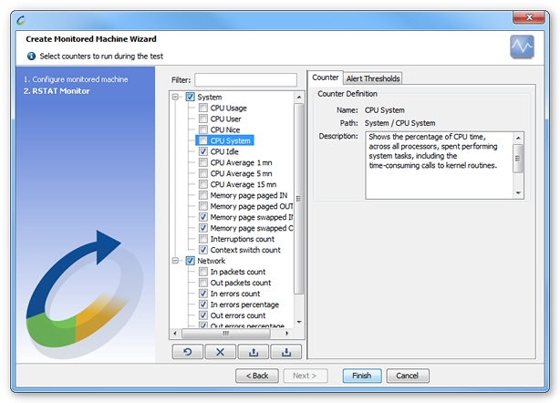 NeoLoad makes it possible to create a new monitor either using the monitored machine creation wizard, as described in Configure a monitored machine, or from an existing monitored machine, as described in Create and configure a monitor: