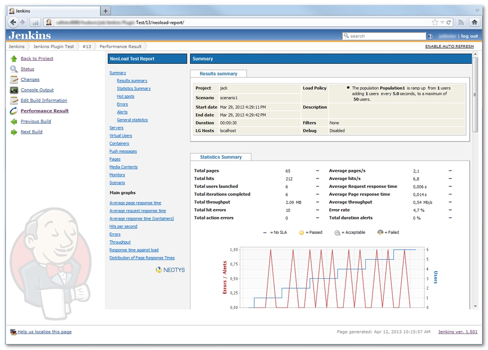For every build performed by Jenkins, the NeoLoad plugin makes it possible to display the NeoLoad HTML results. In Jenkins, it is necessary to select a job and a successful build before clicking Performance Result to display the NeoLoad Test Report page.
