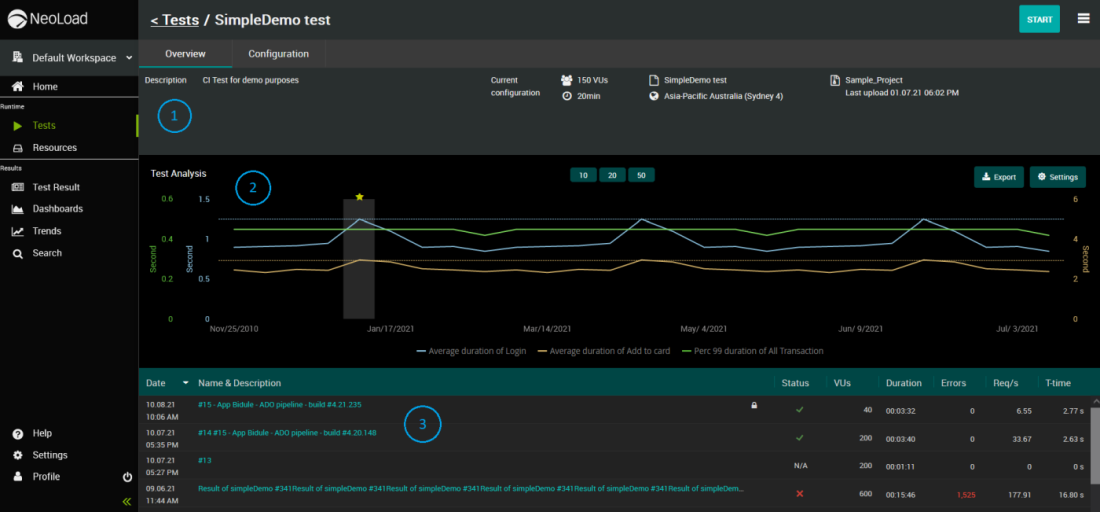 The Overview tab presents all basic details of a test. Most importantly, it displays all the test run results in a graph and list view.