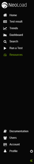 Le panneau de navigation apparaît sur le côté gauche de NeoLoad Web et contient des liens vers les différentes vues. Il peut être masqué pour créer plus d'espace afin de voir le contenu au centre de l'écran. Il peut également être agrandi pour permettre la navigation vers d'autres vues de NeoLoad Web.