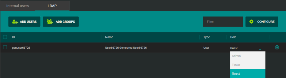Dans l'onglet LDAP, le tableau liste les utilisateurs autorisés à NeoLoad Web, leurs rôles et autres détails principaux (voir capture d'écran ci-dessous).