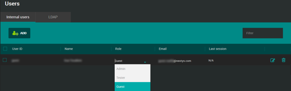 En tant qu'administrateur de Neoload ou de compte, vous pouvez visualiser les utilisateurs internes existants sur site et modifier leurs rôles.