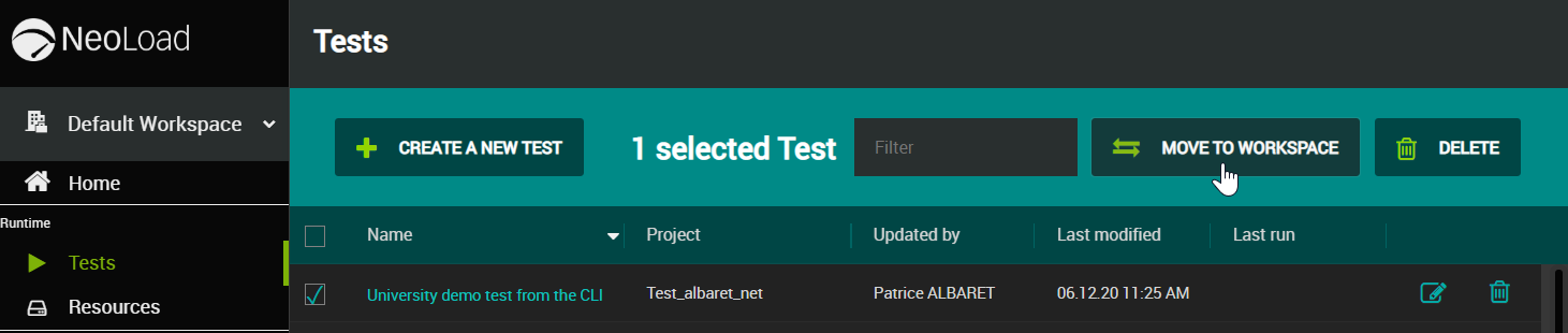 Pour les versions 2.1 à 4.0 de NeoLoad Web, reportez-vous à la section Déplacer des tests entre Workspaces.