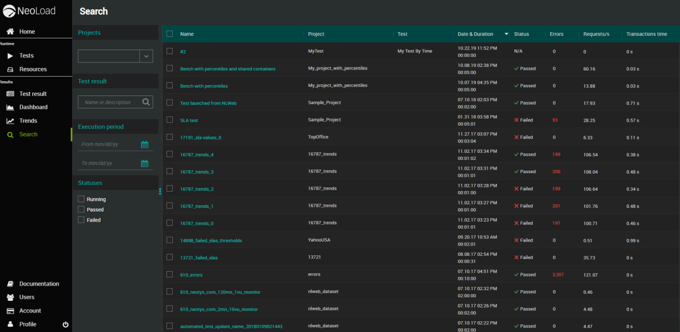 La vue Search affiche dynamiquement tous les résultats de tests envoyés depuis Neoload ou exécutés depuis NeoLoad Web.