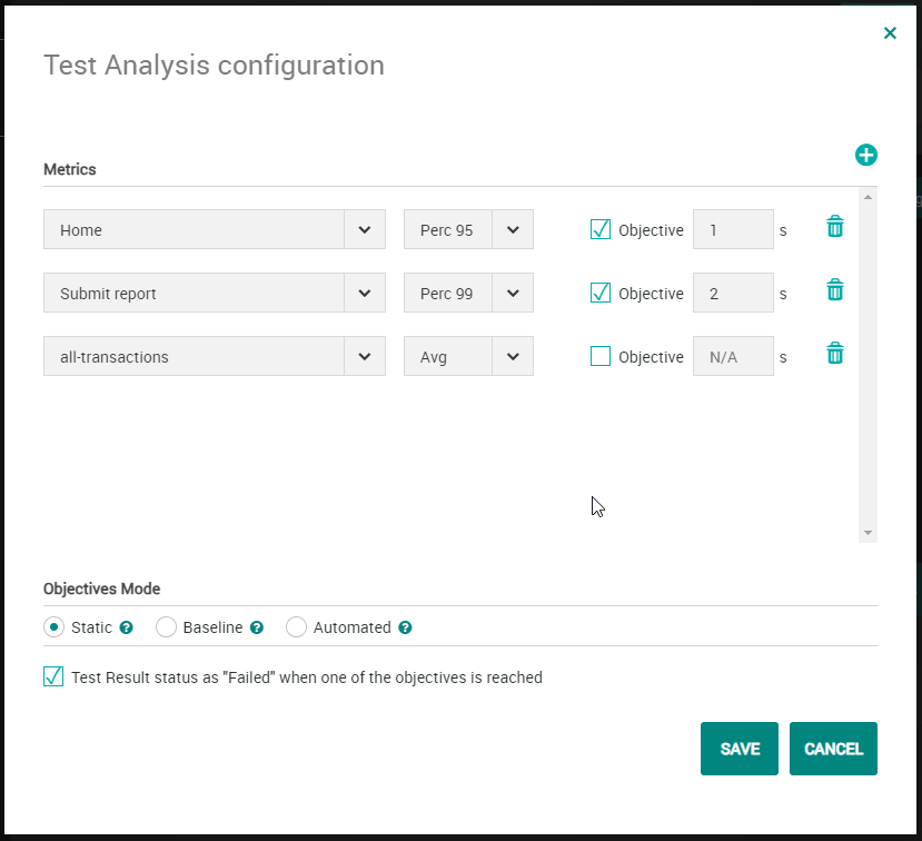 Dans la boîte de dialogue Test Analysis Configuration, cochez une ou plusieurs cases Objective pour spécifier une valeur métrique personnalisée.