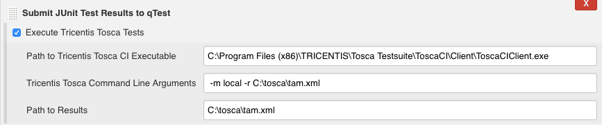 If you want the script to execute Tricentis Tosca tests, select the Execute Tricentis Tosca Tests check box. Then enter the following information: