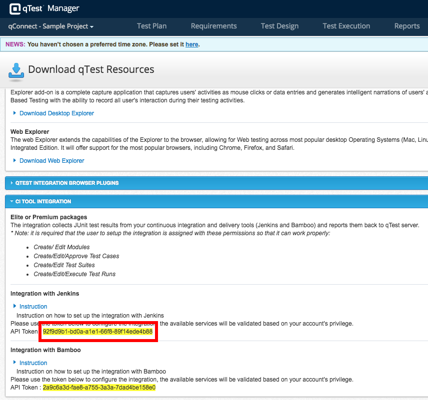 Copy the API token from the Integration with Jenkins section. This allows Jenkins to access your qTest Manager instance.