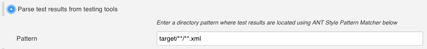 Parse test results from testing tools: Selected by default. If selected, the Plug-in will scan for the XML files that contain the test results. You can optionally specify a directory pattern where these XML files are located, using ANT Style Pattern. If not specified, the Plug-in will scan the whole project.