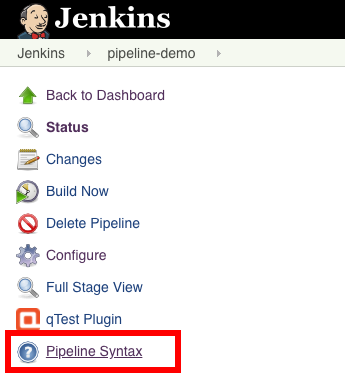 From your Jenkins project, select Pipeline Syntax in the left panel.