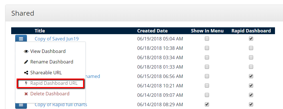 To use the Rapid Dashboard URL, select the blue Action icon to the left of the Dashboard name.