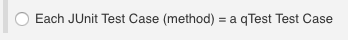 Each JUnit Test Case (method) = a qTest Test Case: A qTest Test Case is created from a JUnit Test Case (method).
