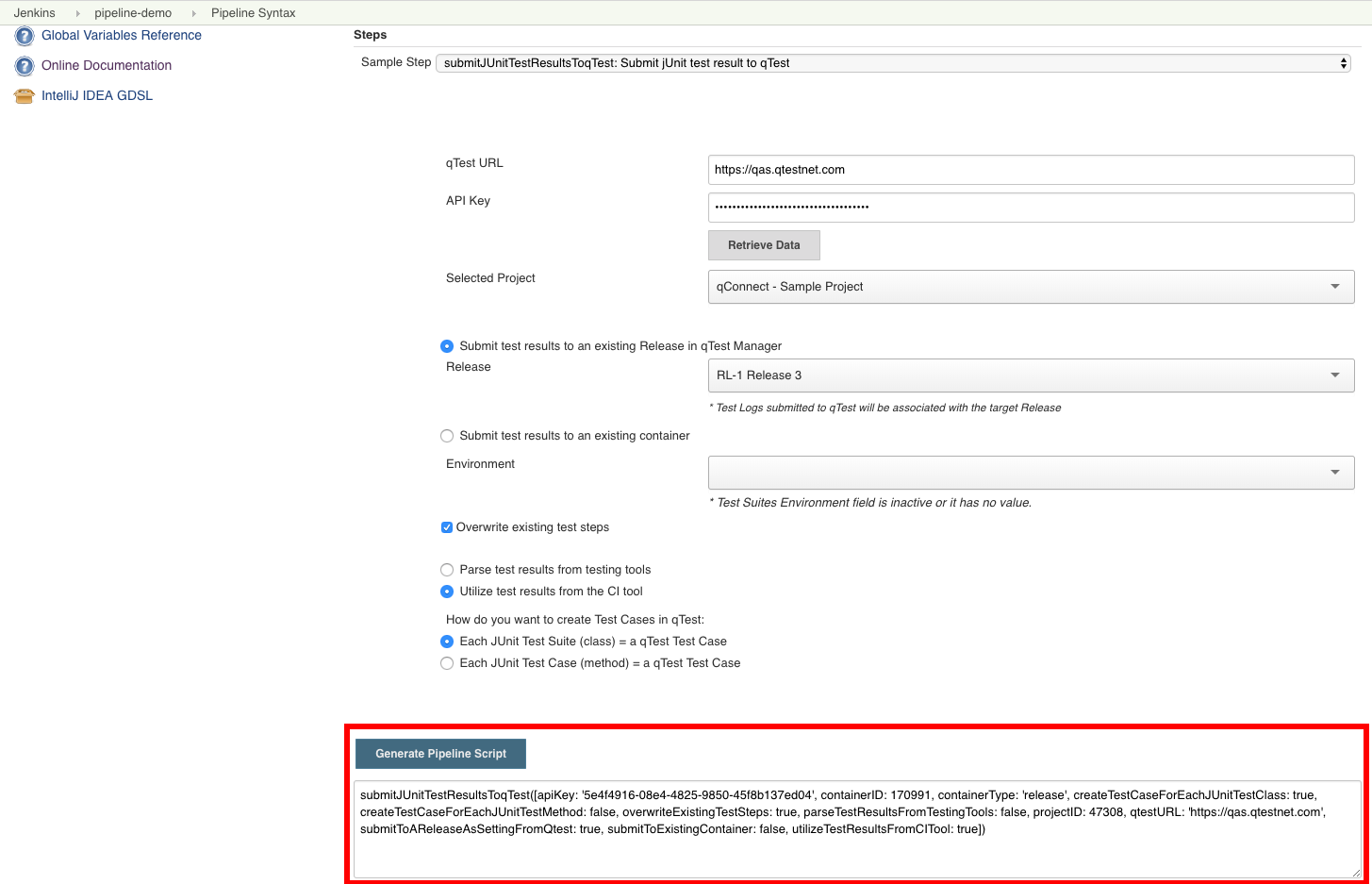 Pipeline: Generate pipeline script from qTest Jenkins Plug-in and put it in your pipeline code as a step to submits test results to a qTest Manager project.
