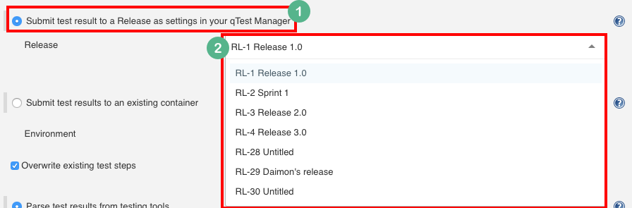 Submit test result to a Release as settings in your qTest Manager. By selecting this option, the qTest Plug-in will submit the test results to a Release in qTest Manager (refer to the Organizing Test Runs section for more information on setting this up). Select a Release, which will be the target release of submitted Test Runs.