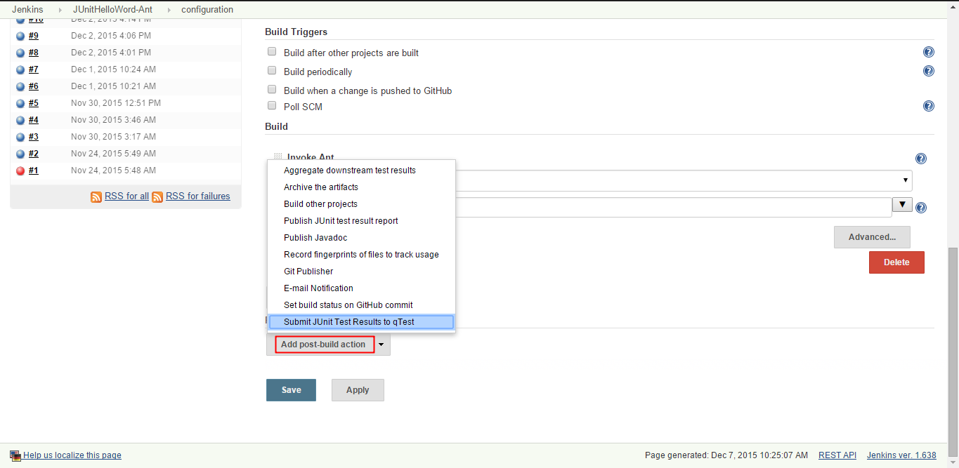 Jenkins: Select a build project. Select the qTest Plug-in on the left panel.
