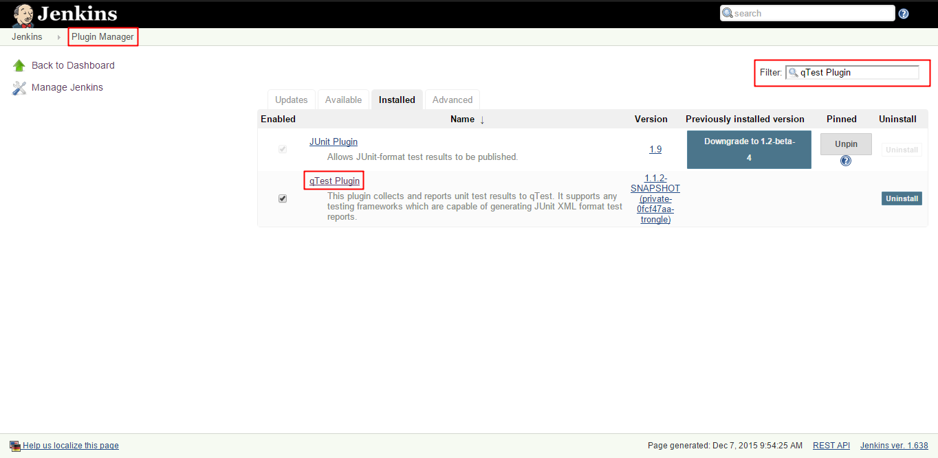 From the Jenkins Plug-in Manager, search for the qTest Plug-in and install.