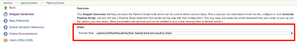 Pipeline: Generate pipeline script from qTest Jenkins Plug-in and put it in your pipeline code as a step to submits test results to a qTest Manager project.