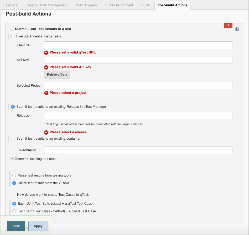 Freestyle: Use qTest Jenkins Plug-in in your post-build actions to submit test results to your qTest Manager project.