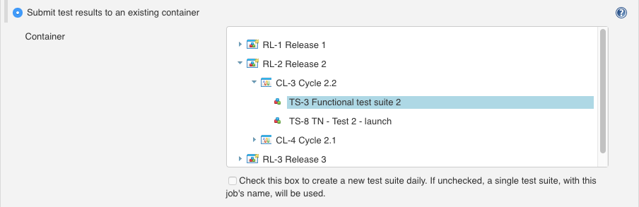 Container: Select a container where you want your test results to be submitted, such as a Release, a Test Cycle, or a Test Suite. The Plug-in will create a Test Suite directly under the selected container. Then it creates Test Runs underneath that Test Suite. It will then submit Test Logs to those Test Runs. If the Test Suite already exists, the Plug-in will not create duplicate Test Suites but will submit test results to that Test Suite.