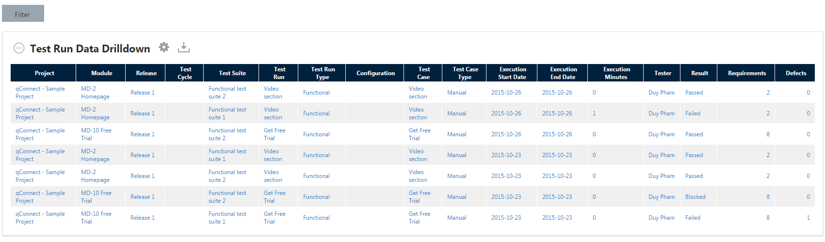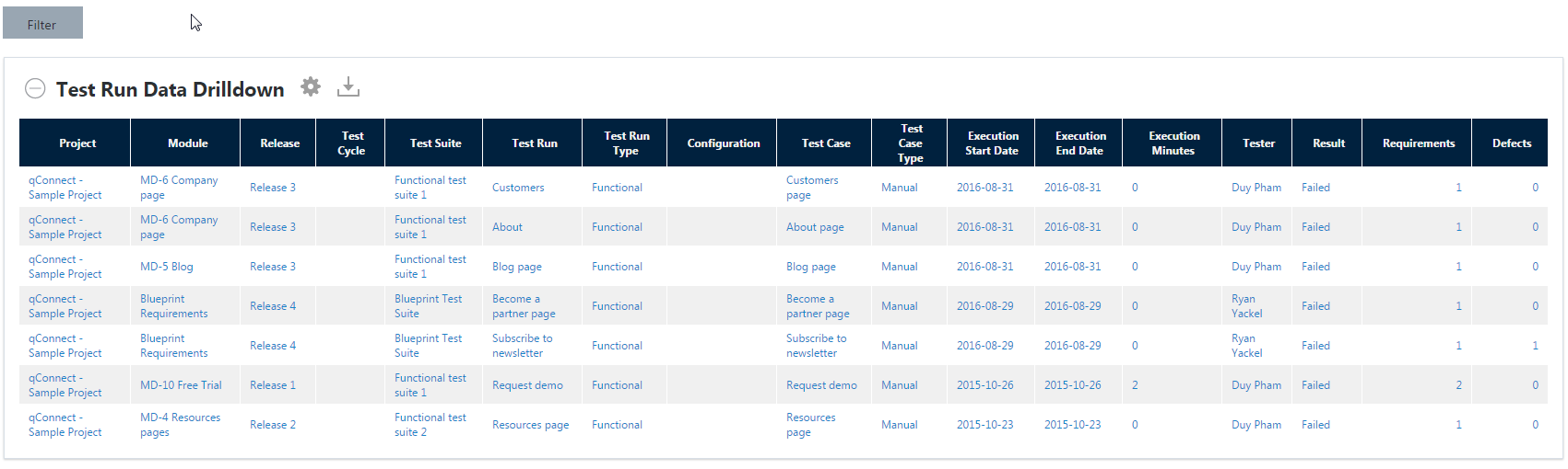 You can select any data point on this chart. This lets you access the drilldown report, which provides detailed information for each data point, such as Project, Test Case, or Module.