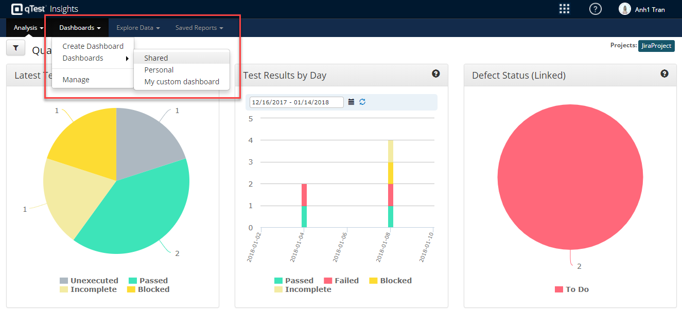 From the Dashboards drop-down, hover over the Dashboards menu option and select either Shared, Personal, or any custom dashboard.