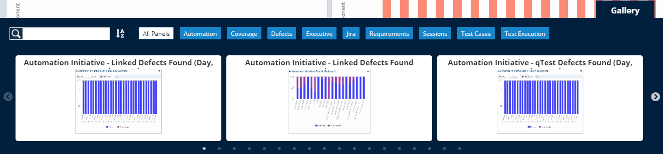 Open the Dashboard Gallery for easy viewing of the chart panels, which displays as a carousel at the bottom of the Dashboard screen. You can collapse/expand the Dashboard Gallery by selecting the Gallery tab.