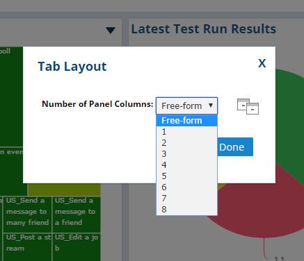 Select Change Layout from the configure options of the tab. In the tab layout pop-up, you can choose how to layout the dashboard panels.