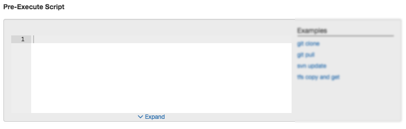 This section provides examples to be used as pre-execute scripts. You can select any of the examples in this section, and it will be appended to the Pre-Execute Script editor. Screenshots below show what a git clone example looks like when you click on it.