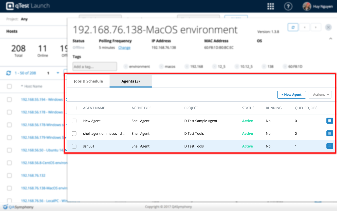 Agents: Shows all agents running at the host including: Agent Name, Agent Type, Project that the agent is associated to, its status and # of jobs being queued from that agent