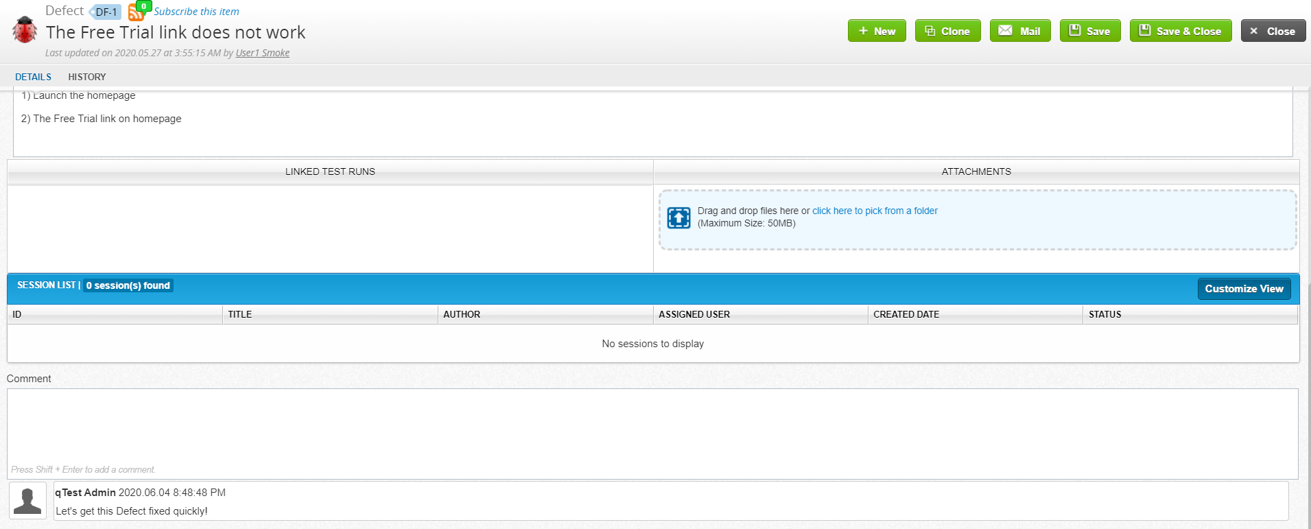Defects The Defects tab and the Comment field are only used when you do not have a Defect integration. Save the Defect to enable the Comment field.