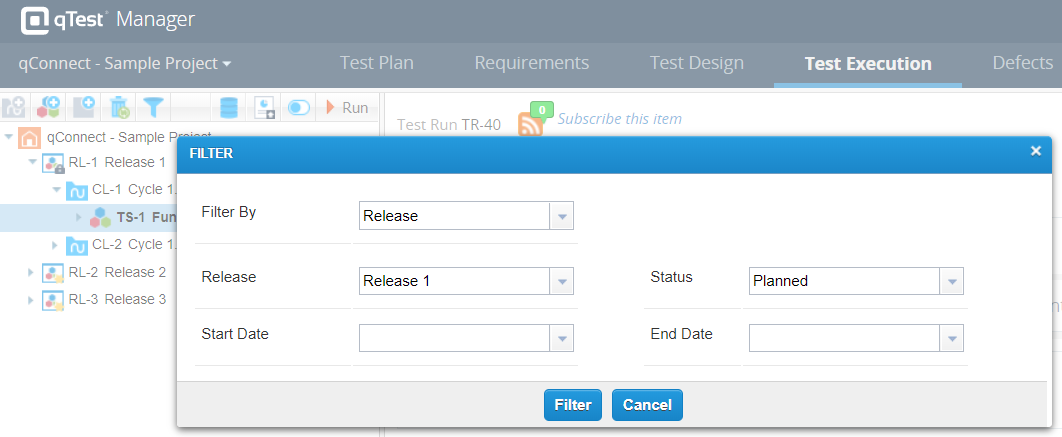 | Test Plan | Create a plan with Releases and Builds to define the testing objectives for each Release or Build. Add specific Requirements to the Release and Build scopes. While release and build are the qTest terms, these objects can be used for other time periods, such as sprints for Agile projects or different phases of testing for Waterfall projects. |