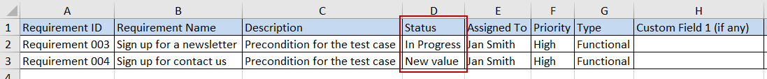 Continuing the example, suppose your Excel spreadsheet contains two Requirements. In Requirement 003, the value In Progress for the Status field matches an existing value for this field in qTest Manager. However, in Requirement 004, the value New value for the Status field does not match an existing value for this field in qTest Manager. This value should be updated to match an available value for the Status field in qTest Manager.