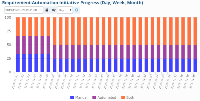 A stacked bar graph that shows the amount of Requirements that are either manual, automated, or both. This data is tracked by either the day, week, or month. |