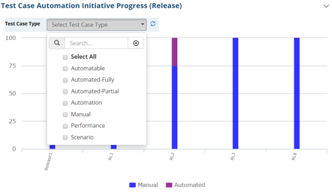 A stacked bar graph that shows the amount of Test Cases that are either manual, automated, or both. This data is tracked by Release. |