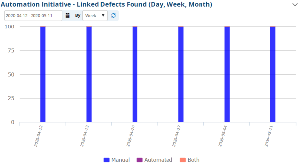| qTest | Automation Initiative - Linked Defects Found (Day, Week, Month) | A stacked bar graph that shows the amount of found linked Defects that are either manual, automated, or both. This data can be tracked and displayed by either the day, week, or month. |